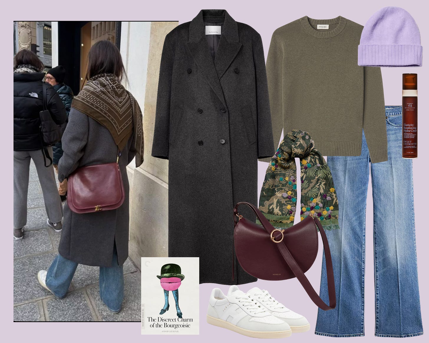 The green embroidered scarf and lilac cashmere hat add some color to the outfit.