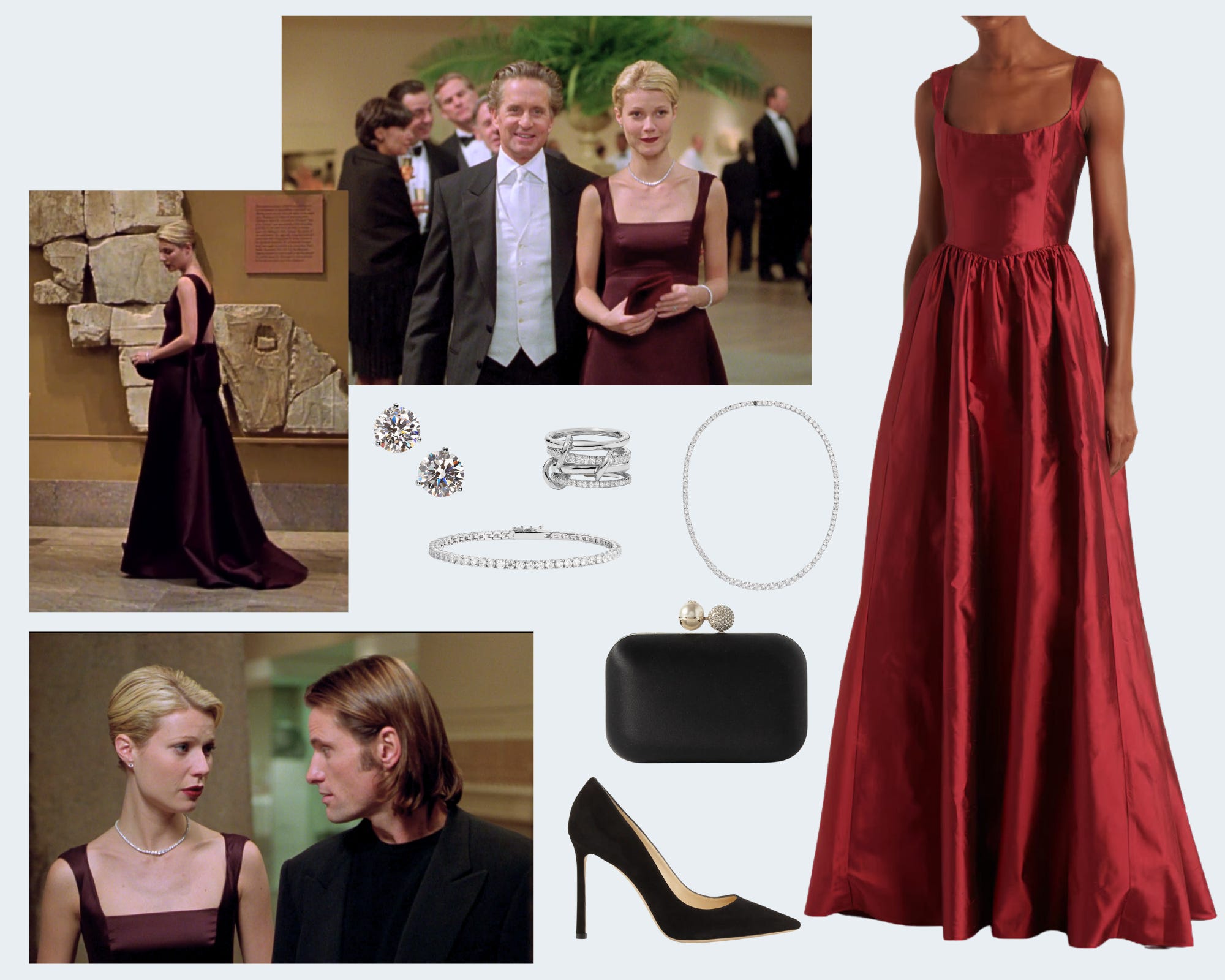 Outfit details: This time I managed to find a pretty similar dress to the Balenciaga dress Gwyneth wears in the film with this raspberry Markarian silk corset gown. I also found a beautiful aubergine one-shoulder twill gown, this less expensive bow-trim charmeuse cowlneck gown, and this one shoulder dress. I read somewhere that Cartier loaned the jewels for the evening event and they came with their own guards. A much more reasonably priced necklace option is this Graduated Cubic Zirconia Collar Necklace for $199. The 4ct tw Cubic Zirconia Earrings are only $50. If the film was set today, I feel like Emily Taylor would choose this Spinelli Kilcollin Polaris set of four 18-karat white gold diamond rings. The Cubic Zirconia Tennis Bracelet is another great deal at $99. All the CZ pieces are available in gold and platinum options. In the film she carries a satin evening clutch in the same color as her dress that was probably specially dyed. It would be pretty impossible to match a bag without shopping in person I’d pair the dress with this black embellished satin clutch. The Gabriela Hearst Demi satin bag in crimson would also be a great option if it matched. I’d finish off the outfit with black suede pumps.