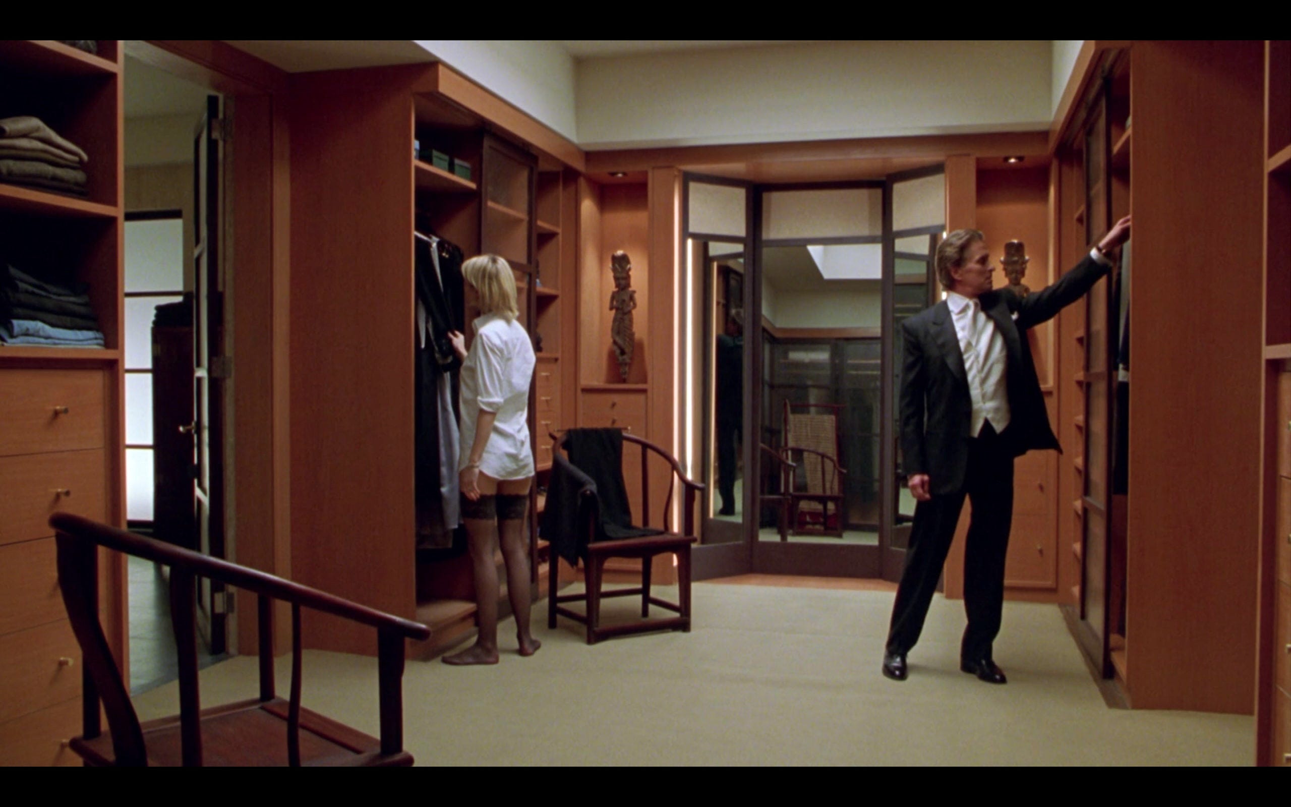 On the audio commentary Costume Designer Ellen Mirojnick said of A Perfect Murder, “It was a picture that had to capture the ambience of wealth, sophistication, and a modern New York. The characters played by Michael Douglas and Gwyneth Paltrow lived on the Upper East Side in New York and were very wealthy and had anything that could ever want in their life at their disposal. The character that Michael plays is a character who is very much in control. He controls everything, his environment, people, places, and things, therefore, he needed to have a look that was sophisticated, elegant, and structured and rigid, almost like armor. The cut in his suits were always the same. This gentleman was not a man who would ever deviate from something that he knew and knew well.”